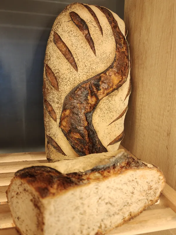 - Pain rustique Bio (farine de blé T65, blé intégral, seigle T130, graines grillées et levain naturel).